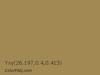 Yxy 26.197,0.4,0.413 Color is a normal orange color and the nearest color is Barley Corn #a68b5b. Hex code #a28953 and RGB value is rgb(162,137,83). In RGB color space, this color is composed of 64% red, 54% green, 33% blue, In CMYK color space, this color is composed of 0% cyan, 15% magenta, 49% yellow , 36% black , In HSL color space, this color has a hue angle of 41° , 32% saturation and 48% lightness.
