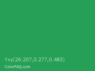 Yxy 26.207,0.277,0.483 Color is a normal green color and the nearest color is Sea Green #2e8b57. Hex code #26a056 and RGB value is rgb(38,160,86). In RGB color space, this color is composed of 15% red, 63% green, 34% blue, In CMYK color space, this color is composed of 76% cyan, 0% magenta, 46% yellow , 37% black , In HSL color space, this color has a hue angle of 144° , 62% saturation and 39% lightness.