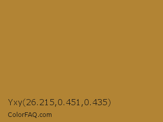 Yxy 26.215,0.451,0.435 Color is a normal orange color and the nearest color is Alpine #af8f2c. Hex code #b28434 and RGB value is rgb(178,132,52). In RGB color space, this color is composed of 70% red, 52% green, 20% blue, In CMYK color space, this color is composed of 0% cyan, 26% magenta, 71% yellow , 30% black , In HSL color space, this color has a hue angle of 38° , 55% saturation and 45% lightness.
