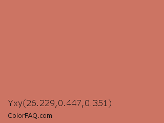 Yxy 26.229,0.447,0.351 Color is a normal red color and the nearest color is Contessa #c6726b. Hex code #cc7463 and RGB value is rgb(204,116,99). In RGB color space, this color is composed of 80% red, 45% green, 39% blue, In CMYK color space, this color is composed of 0% cyan, 43% magenta, 51% yellow , 20% black , In HSL color space, this color has a hue angle of 10° , 51% saturation and 59% lightness.