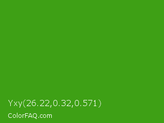 Yxy 26.22,0.32,0.571 Color is a normal green color and the nearest color is Slimy Green #299617. Hex code #3ea015 and RGB value is rgb(62,160,21). In RGB color space, this color is composed of 24% red, 63% green, 8% blue, In CMYK color space, this color is composed of 61% cyan, 0% magenta, 87% yellow , 37% black , In HSL color space, this color has a hue angle of 102° , 77% saturation and 35% lightness.