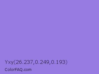 Yxy 26.237,0.249,0.193 Color is a light indigo color and the nearest color is Medium Purple #9370db. Hex code #987ae3 and RGB value is rgb(152,122,227). In RGB color space, this color is composed of 60% red, 48% green, 89% blue, In CMYK color space, this color is composed of 33% cyan, 46% magenta, 0% yellow , 11% black , In HSL color space, this color has a hue angle of 257° , 65% saturation and 68% lightness.