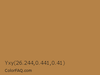Yxy 26.244,0.441,0.41 Color is a normal orange color and the nearest color is Driftwood #af8751. Hex code #b58247 and RGB value is rgb(181,130,71). In RGB color space, this color is composed of 71% red, 51% green, 28% blue, In CMYK color space, this color is composed of 0% cyan, 28% magenta, 61% yellow , 29% black , In HSL color space, this color has a hue angle of 32° , 44% saturation and 49% lightness.