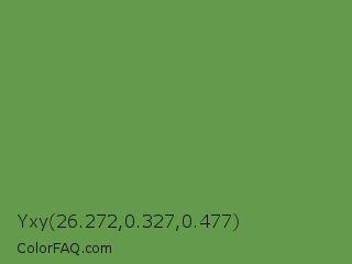 Yxy 26.272,0.327,0.477 Color is a normal green color and the nearest color is Palm Leaf #6f9940. Hex code #639a4b and RGB value is rgb(99,154,75). In RGB color space, this color is composed of 39% red, 60% green, 29% blue, In CMYK color space, this color is composed of 36% cyan, 0% magenta, 51% yellow , 40% black , In HSL color space, this color has a hue angle of 102° , 34% saturation and 45% lightness.