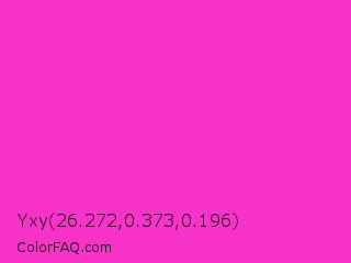 Yxy 26.272,0.373,0.196 Color is a normal magenta color and the nearest color is Razzle Dazzle Rose #ff33cc. Hex code #f732c9 and RGB value is rgb(247,50,201). In RGB color space, this color is composed of 97% red, 20% green, 79% blue, In CMYK color space, this color is composed of 0% cyan, 80% magenta, 19% yellow , 3% black , In HSL color space, this color has a hue angle of 314° , 92% saturation and 58% lightness.