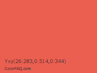 Yxy 26.283,0.514,0.344 Color is a light red color and the nearest color is Jelly Bean #da614e. Hex code #e96051 and RGB value is rgb(233,96,81). In RGB color space, this color is composed of 91% red, 38% green, 32% blue, In CMYK color space, this color is composed of 0% cyan, 59% magenta, 65% yellow , 9% black , In HSL color space, this color has a hue angle of 6° , 78% saturation and 62% lightness.