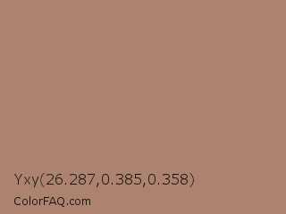 Yxy 26.287,0.385,0.358 Color is a normal orange color and the nearest color is Light Taupe #b38b6d. Hex code #ad8370 and RGB value is rgb(173,131,112). In RGB color space, this color is composed of 68% red, 51% green, 44% blue, In CMYK color space, this color is composed of 0% cyan, 24% magenta, 35% yellow , 32% black , In HSL color space, this color has a hue angle of 19° , 27% saturation and 56% lightness.