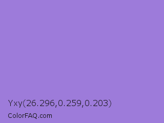 Yxy 26.296,0.259,0.203 Color is a light violet color and the nearest color is Lilac Bush #9874d3. Hex code #9d7bda and RGB value is rgb(157,123,218). In RGB color space, this color is composed of 62% red, 48% green, 85% blue, In CMYK color space, this color is composed of 28% cyan, 44% magenta, 0% yellow , 15% black , In HSL color space, this color has a hue angle of 261° , 56% saturation and 67% lightness.