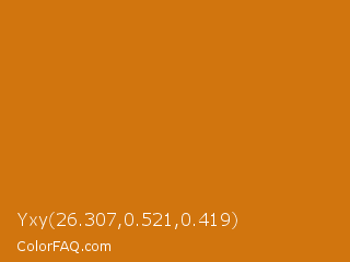 Yxy 26.307,0.521,0.419 Color is a normal orange color and the nearest color is Meteor #d07d12. Hex code #d1750e and RGB value is rgb(209,117,14). In RGB color space, this color is composed of 82% red, 46% green, 5% blue, In CMYK color space, this color is composed of 0% cyan, 44% magenta, 93% yellow , 18% black , In HSL color space, this color has a hue angle of 32° , 87% saturation and 44% lightness.