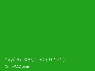 Yxy 26.309,0.303,0.575 Color is a normal green color and the nearest color is Slimy Green #299617. Hex code #23a21e and RGB value is rgb(35,162,30). In RGB color space, this color is composed of 14% red, 64% green, 12% blue, In CMYK color space, this color is composed of 78% cyan, 0% magenta, 81% yellow , 36% black , In HSL color space, this color has a hue angle of 118° , 69% saturation and 38% lightness.