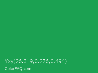 Yxy 26.319,0.276,0.494 Color is a normal green color and the nearest color is Green Pigment #00a550. Hex code #1ba152 and RGB value is rgb(27,161,82). In RGB color space, this color is composed of 11% red, 63% green, 32% blue, In CMYK color space, this color is composed of 83% cyan, 0% magenta, 49% yellow , 37% black , In HSL color space, this color has a hue angle of 145° , 71% saturation and 37% lightness.