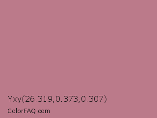 Yxy 26.319,0.373,0.307 Color is a light red color and the nearest color is Old Rose #c08081. Hex code #bb7a8a and RGB value is rgb(187,122,138). In RGB color space, this color is composed of 73% red, 48% green, 54% blue, In CMYK color space, this color is composed of 0% cyan, 35% magenta, 26% yellow , 27% black , In HSL color space, this color has a hue angle of 345° , 32% saturation and 61% lightness.