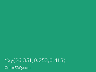 Yxy 26.351,0.253,0.413 Color is a normal green color and the nearest color is Green Crayola #1cac78. Hex code #1c9f76 and RGB value is rgb(28,159,118). In RGB color space, this color is composed of 11% red, 62% green, 46% blue, In CMYK color space, this color is composed of 82% cyan, 0% magenta, 26% yellow , 38% black , In HSL color space, this color has a hue angle of 161° , 70% saturation and 37% lightness.