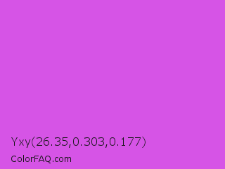 Yxy 26.35,0.303,0.177 Color is a light magenta color and the nearest color is Orchid #da70d6. Hex code #d654e6 and RGB value is rgb(214,84,230). In RGB color space, this color is composed of 84% red, 33% green, 90% blue, In CMYK color space, this color is composed of 7% cyan, 63% magenta, 0% yellow , 10% black , In HSL color space, this color has a hue angle of 293° , 74% saturation and 62% lightness.