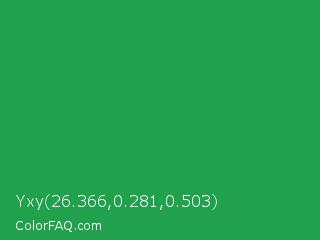 Yxy 26.366,0.281,0.503 Color is a normal green color and the nearest color is Sea Green #2e8b57. Hex code #21a14d and RGB value is rgb(33,161,77). In RGB color space, this color is composed of 13% red, 63% green, 30% blue, In CMYK color space, this color is composed of 80% cyan, 0% magenta, 52% yellow , 37% black , In HSL color space, this color has a hue angle of 141° , 66% saturation and 38% lightness.
