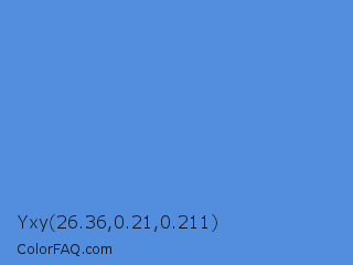 Yxy 26.36,0.21,0.211 Color is a normal blue color and the nearest color is Havelock Blue #5590d9. Hex code #528edd and RGB value is rgb(82,142,221). In RGB color space, this color is composed of 32% red, 56% green, 87% blue, In CMYK color space, this color is composed of 63% cyan, 36% magenta, 0% yellow , 13% black , In HSL color space, this color has a hue angle of 214° , 67% saturation and 59% lightness.