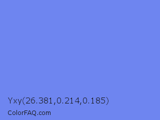 Yxy 26.381,0.214,0.185 Color is a light blue color and the nearest color is Cornflower Blue #6495ed. Hex code #6e85f0 and RGB value is rgb(110,133,240). In RGB color space, this color is composed of 43% red, 52% green, 94% blue, In CMYK color space, this color is composed of 54% cyan, 45% magenta, 0% yellow , 6% black , In HSL color space, this color has a hue angle of 229° , 81% saturation and 69% lightness.