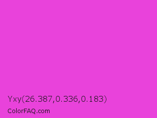 Yxy 26.387,0.336,0.183 Color is a normal magenta color and the nearest color is Purple Pizzazz #fe4eda. Hex code #e942db and RGB value is rgb(233,66,219). In RGB color space, this color is composed of 91% red, 26% green, 86% blue, In CMYK color space, this color is composed of 0% cyan, 72% magenta, 6% yellow , 9% black , In HSL color space, this color has a hue angle of 305° , 79% saturation and 59% lightness.