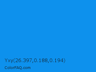 Yxy 26.397,0.188,0.194 Color is a normal blue color and the nearest color is Dodger Blue #1e90ff. Hex code #0d91ed and RGB value is rgb(13,145,237). In RGB color space, this color is composed of 5% red, 57% green, 93% blue, In CMYK color space, this color is composed of 95% cyan, 39% magenta, 0% yellow , 7% black , In HSL color space, this color has a hue angle of 205° , 90% saturation and 49% lightness.