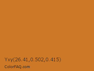 Yxy 26.41,0.502,0.415 Color is a normal orange color and the nearest color is Ochre #cc7722. Hex code #cc7826 and RGB value is rgb(204,120,38). In RGB color space, this color is composed of 80% red, 47% green, 15% blue, In CMYK color space, this color is composed of 0% cyan, 41% magenta, 81% yellow , 20% black , In HSL color space, this color has a hue angle of 30° , 69% saturation and 47% lightness.