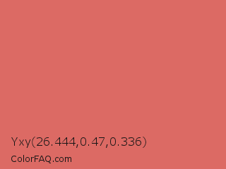 Yxy 26.444,0.47,0.336 Color is a light red color and the nearest color is Sunglo #e16865. Hex code #dc6a64 and RGB value is rgb(220,106,100). In RGB color space, this color is composed of 86% red, 42% green, 39% blue, In CMYK color space, this color is composed of 0% cyan, 52% magenta, 55% yellow , 14% black , In HSL color space, this color has a hue angle of 3° , 63% saturation and 63% lightness.