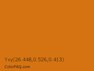 Yxy 26.448,0.526,0.413 Color is a normal orange color and the nearest color is Meteor #d07d12. Hex code #d57312 and RGB value is rgb(213,115,18). In RGB color space, this color is composed of 84% red, 45% green, 7% blue, In CMYK color space, this color is composed of 0% cyan, 46% magenta, 92% yellow , 16% black , In HSL color space, this color has a hue angle of 30° , 84% saturation and 45% lightness.