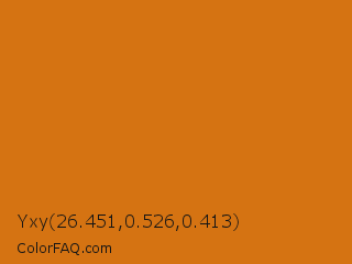 Yxy 26.451,0.526,0.413 Color is a normal orange color and the nearest color is Meteor #d07d12. Hex code #d57312 and RGB value is rgb(213,115,18). In RGB color space, this color is composed of 84% red, 45% green, 7% blue, In CMYK color space, this color is composed of 0% cyan, 46% magenta, 92% yellow , 16% black , In HSL color space, this color has a hue angle of 30° , 84% saturation and 45% lightness.