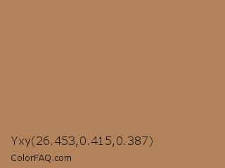Yxy 26.453,0.415,0.387 Color is a normal orange color and the nearest color is Deer #ba8759. Hex code #b2835b and RGB value is rgb(178,131,91). In RGB color space, this color is composed of 70% red, 51% green, 36% blue, In CMYK color space, this color is composed of 0% cyan, 26% magenta, 49% yellow , 30% black , In HSL color space, this color has a hue angle of 28° , 36% saturation and 53% lightness.