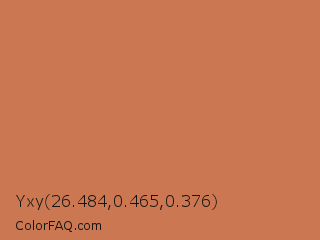 Yxy 26.484,0.465,0.376 Color is a normal orange color and the nearest color is Copper Red #cb6d51. Hex code #cb7751 and RGB value is rgb(203,119,81). In RGB color space, this color is composed of 80% red, 47% green, 32% blue, In CMYK color space, this color is composed of 0% cyan, 41% magenta, 60% yellow , 20% black , In HSL color space, this color has a hue angle of 19° , 54% saturation and 56% lightness.