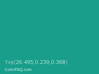Yxy 26.495,0.239,0.368 Color is a normal cyan color and the nearest color is Niagara #06a189. Hex code #189e8a and RGB value is rgb(24,158,138). In RGB color space, this color is composed of 9% red, 62% green, 54% blue, In CMYK color space, this color is composed of 85% cyan, 0% magenta, 13% yellow , 38% black , In HSL color space, this color has a hue angle of 171° , 74% saturation and 36% lightness.