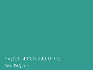 Yxy 26.499,0.242,0.35 Color is a normal cyan color and the nearest color is Zomp #39a78e. Hex code #329c91 and RGB value is rgb(50,156,145). In RGB color space, this color is composed of 20% red, 61% green, 57% blue, In CMYK color space, this color is composed of 68% cyan, 0% magenta, 7% yellow , 39% black , In HSL color space, this color has a hue angle of 174° , 51% saturation and 40% lightness.