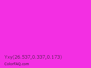 Yxy 26.537,0.337,0.173 Color is a normal magenta color and the nearest color is Razzle Dazzle Rose #ff33cc. Hex code #f32fe3 and RGB value is rgb(243,47,227). In RGB color space, this color is composed of 95% red, 18% green, 89% blue, In CMYK color space, this color is composed of 0% cyan, 81% magenta, 7% yellow , 5% black , In HSL color space, this color has a hue angle of 305° , 89% saturation and 57% lightness.