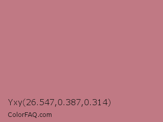 Yxy 26.547,0.387,0.314 Color is a light red color and the nearest color is Old Rose #c08081. Hex code #c07984 and RGB value is rgb(192,121,132). In RGB color space, this color is composed of 75% red, 47% green, 52% blue, In CMYK color space, this color is composed of 0% cyan, 37% magenta, 31% yellow , 25% black , In HSL color space, this color has a hue angle of 351° , 36% saturation and 61% lightness.
