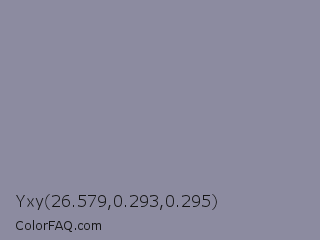 Yxy 26.579,0.293,0.295 Color is a normal indigo color and the nearest color is Manatee Crayola #8d90a1. Hex code #8c8ba0 and RGB value is rgb(140,139,160). In RGB color space, this color is composed of 55% red, 55% green, 63% blue, In CMYK color space, this color is composed of 13% cyan, 13% magenta, 0% yellow , 37% black , In HSL color space, this color has a hue angle of 243° , 10% saturation and 59% lightness.