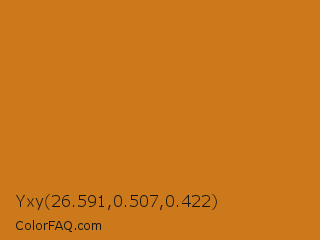 Yxy 26.591,0.507,0.422 Color is a normal orange color and the nearest color is Ochre #cc7722. Hex code #cc791b and RGB value is rgb(204,121,27). In RGB color space, this color is composed of 80% red, 47% green, 11% blue, In CMYK color space, this color is composed of 0% cyan, 41% magenta, 87% yellow , 20% black , In HSL color space, this color has a hue angle of 32° , 77% saturation and 45% lightness.