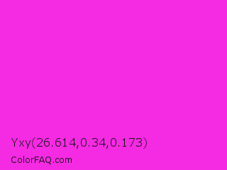 Yxy 26.614,0.34,0.173 Color is a normal magenta color and the nearest color is Hot Magenta #ff1dce. Hex code #f52ae3 and RGB value is rgb(245,42,227). In RGB color space, this color is composed of 96% red, 16% green, 89% blue, In CMYK color space, this color is composed of 0% cyan, 83% magenta, 7% yellow , 4% black , In HSL color space, this color has a hue angle of 305° , 91% saturation and 56% lightness.