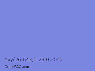 Yxy 26.643,0.23,0.204 Color is a light blue color and the nearest color is Chetwode Blue #8581d9. Hex code #7a86e0 and RGB value is rgb(122,134,224). In RGB color space, this color is composed of 48% red, 53% green, 88% blue, In CMYK color space, this color is composed of 46% cyan, 40% magenta, 0% yellow , 12% black , In HSL color space, this color has a hue angle of 233° , 62% saturation and 68% lightness.