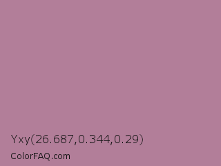 Yxy 26.687,0.344,0.29 Color is a normal rose color and the nearest color is Bouquet #ae809e. Hex code #b27e99 and RGB value is rgb(178,126,153). In RGB color space, this color is composed of 70% red, 49% green, 60% blue, In CMYK color space, this color is composed of 0% cyan, 29% magenta, 14% yellow , 30% black , In HSL color space, this color has a hue angle of 329° , 25% saturation and 60% lightness.