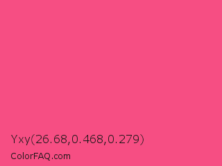 Yxy 26.68,0.468,0.279 Color is a light rose color and the nearest color is French Rose #f64a8a. Hex code #f64e83 and RGB value is rgb(246,78,131). In RGB color space, this color is composed of 96% red, 31% green, 51% blue, In CMYK color space, this color is composed of 0% cyan, 68% magenta, 47% yellow , 4% black , In HSL color space, this color has a hue angle of 341° , 90% saturation and 64% lightness.