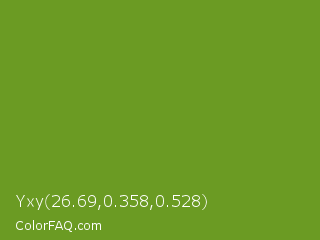 Yxy 26.69,0.358,0.528 Color is a normal green color and the nearest color is Olive Drab #6b8e23. Hex code #6b9b23 and RGB value is rgb(107,155,35). In RGB color space, this color is composed of 42% red, 61% green, 14% blue, In CMYK color space, this color is composed of 31% cyan, 0% magenta, 77% yellow , 39% black , In HSL color space, this color has a hue angle of 84° , 63% saturation and 37% lightness.