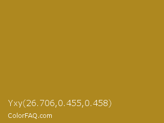 Yxy 26.706,0.455,0.458 Color is a normal orange color and the nearest color is University Of California Gold #b78727. Hex code #ae881f and RGB value is rgb(174,136,31). In RGB color space, this color is composed of 68% red, 53% green, 12% blue, In CMYK color space, this color is composed of 0% cyan, 22% magenta, 82% yellow , 32% black , In HSL color space, this color has a hue angle of 44° , 70% saturation and 40% lightness.