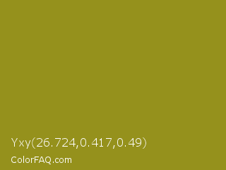 Yxy 26.724,0.417,0.49 Color is a normal yellow color and the nearest color is Hacienda #98811b. Hex code #95911c and RGB value is rgb(149,145,28). In RGB color space, this color is composed of 58% red, 57% green, 11% blue, In CMYK color space, this color is composed of 0% cyan, 3% magenta, 81% yellow , 42% black , In HSL color space, this color has a hue angle of 58° , 68% saturation and 35% lightness.