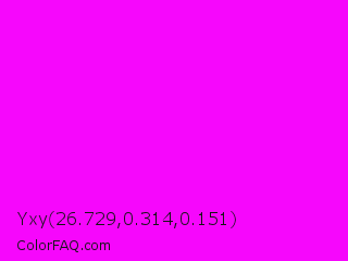 Yxy 26.729,0.314,0.151 Color is a normal magenta color and the nearest color is Magenta / Fuchsia #ff00ff. Hex code #f607fc and RGB value is rgb(246,7,252). In RGB color space, this color is composed of 96% red, 3% green, 99% blue, In CMYK color space, this color is composed of 2% cyan, 97% magenta, 0% yellow , 1% black , In HSL color space, this color has a hue angle of 299° , 98% saturation and 51% lightness.