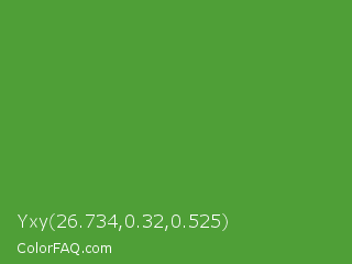 Yxy 26.734,0.32,0.525 Color is a normal green color and the nearest color is Apple #4fa83d. Hex code #4f9f37 and RGB value is rgb(79,159,55). In RGB color space, this color is composed of 31% red, 62% green, 22% blue, In CMYK color space, this color is composed of 50% cyan, 0% magenta, 65% yellow , 38% black , In HSL color space, this color has a hue angle of 106° , 49% saturation and 42% lightness.