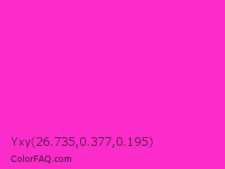 Yxy 26.735,0.377,0.195 Color is a normal magenta color and the nearest color is Razzle Dazzle Rose #ff33cc. Hex code #fc2ccb and RGB value is rgb(252,44,203). In RGB color space, this color is composed of 99% red, 17% green, 80% blue, In CMYK color space, this color is composed of 0% cyan, 83% magenta, 19% yellow , 1% black , In HSL color space, this color has a hue angle of 314° , 97% saturation and 58% lightness.