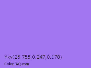 Yxy 26.755,0.247,0.178 Color is a light violet color and the nearest color is Medium Purple #9370db. Hex code #a275f1 and RGB value is rgb(162,117,241). In RGB color space, this color is composed of 64% red, 46% green, 95% blue, In CMYK color space, this color is composed of 33% cyan, 51% magenta, 0% yellow , 5% black , In HSL color space, this color has a hue angle of 262° , 82% saturation and 70% lightness.