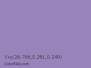 Yxy 26.766,0.281,0.249 Color is a light violet color and the nearest color is Lavender Purple #967bb6. Hex code #9884bb and RGB value is rgb(152,132,187). In RGB color space, this color is composed of 60% red, 52% green, 73% blue, In CMYK color space, this color is composed of 19% cyan, 29% magenta, 0% yellow , 27% black , In HSL color space, this color has a hue angle of 262° , 29% saturation and 63% lightness.