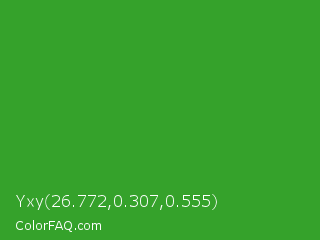 Yxy 26.772,0.307,0.555 Color is a normal green color and the nearest color is Wageningen Green #34b233. Hex code #35a22b and RGB value is rgb(53,162,43). In RGB color space, this color is composed of 21% red, 64% green, 17% blue, In CMYK color space, this color is composed of 67% cyan, 0% magenta, 73% yellow , 36% black , In HSL color space, this color has a hue angle of 115° , 58% saturation and 40% lightness.