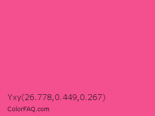 Yxy 26.778,0.449,0.267 Color is a light rose color and the nearest color is French Rose #f64a8a. Hex code #f44f8e and RGB value is rgb(244,79,142). In RGB color space, this color is composed of 96% red, 31% green, 56% blue, In CMYK color space, this color is composed of 0% cyan, 68% magenta, 42% yellow , 4% black , In HSL color space, this color has a hue angle of 337° , 88% saturation and 63% lightness.