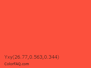 Yxy 26.77,0.563,0.344 Color is a light red color and the nearest color is Ogre Odor #fd5240. Hex code #fc503d and RGB value is rgb(252,80,61). In RGB color space, this color is composed of 99% red, 31% green, 24% blue, In CMYK color space, this color is composed of 0% cyan, 68% magenta, 76% yellow , 1% black , In HSL color space, this color has a hue angle of 6° , 97% saturation and 61% lightness.